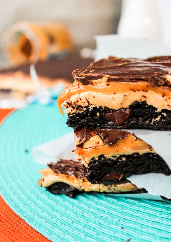 Another riff on the ‘snickers brownies’, this just shows you how versatile a Snickers candy combination can be. After writing this post I’ve had candy bars on the brain, and see that a there are endless combination. This version of the recipe takes a more traditional brownie, tops it with caramel and chocolate, and uses real candy bars. You can get the recipe from backforseconds.com