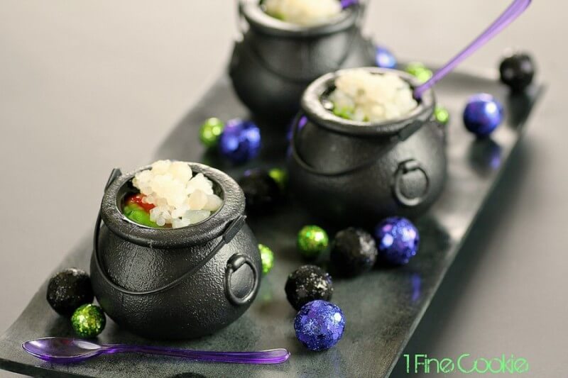 I love these. They are seriously inventive and look cool as well. The idea here is to use a plastic cauldron as a container for a jello shot. Because of the size of them, the end product isn’t a shot per se, instead, it’s alcoholic jello that you can eat with a spoon. Yum! In the image, there is even some foam made from tapioca and gummies have been placed as ingredients in the brew. You could also make a kids version by skipping the alcohol.