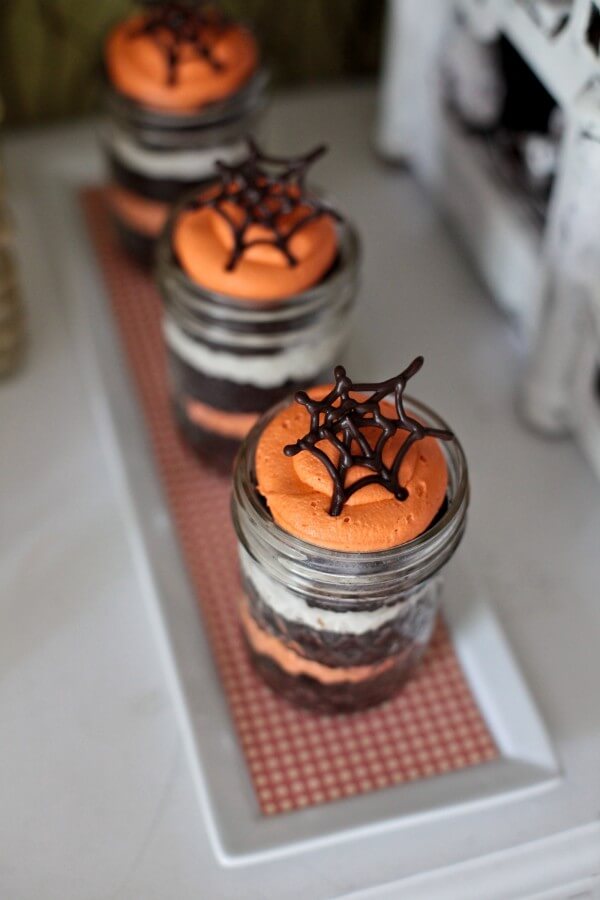 This is another snack that doesn’t look like anything – although it does look cool. They’ve used jars to show off the Halloween colors of this layered cake, and the entire thing has ended up looking pretty cool. You could make it look a bit more like Halloween by putting a spider or something else creepy on top.
