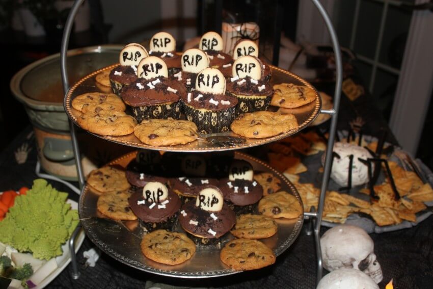Here’s another example of graves – cupcakes this time. Graves seem to work best when you are making them on something that is brown, because it looks like dirt. In this case, it looks like the cupcakes are plain with chocolate icing. Personally, I would do it with chocolate cupcakes, but then again – I’m a sucker for chocolate. In this case, the tombstones seem to be made from half of a milano cookie. That’s a clever trick, because they are already shaped a bit like a tombstone.